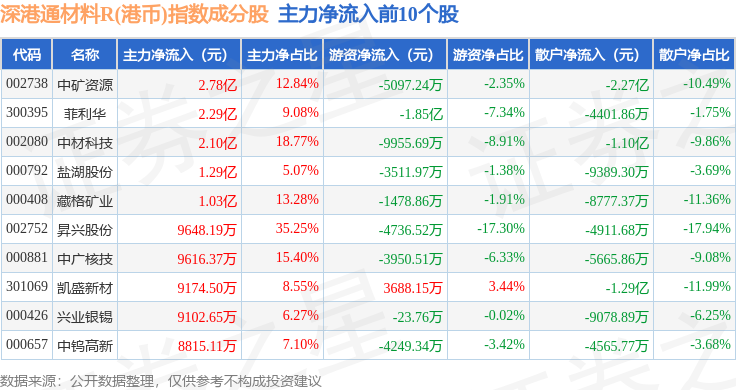 资金流向方面,深港通材料R(港币)(483016)指数成份股当日主力资金净流入合计8.88亿元,游资资金净流入合计1.7亿元,散户资金净流出合计10.58亿元。成份股资金流向详情见下表: