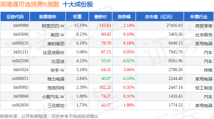 深港通可选消费R(483019)指数十大成份股详情如下: