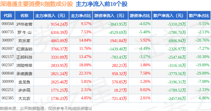 资金流向方面,深港通主要消费R(483021)指数成份股当日主力资金净流出合计1.46亿元,游资资金净流入合计3.74亿元,散户资金净流出合计2.28亿元。成份股资金流向详情见下表: