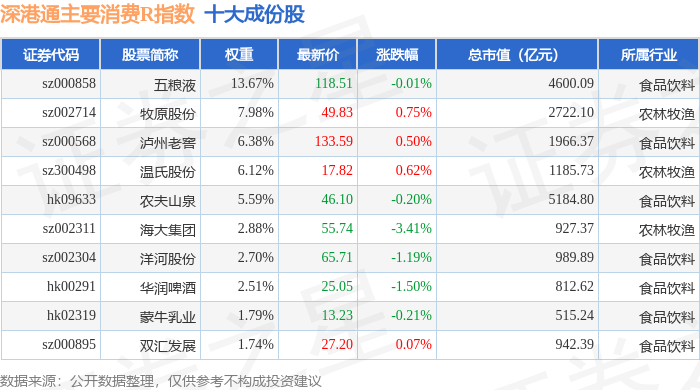 深港通主要消费R(483021)指数十大成份股详情如下: