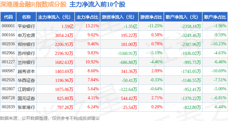 资金流向方面,深港通金融R(483025)指数成份股当日主力资金净流出合计4.52亿元,游资资金净流出合计5833.5万元,散户资金净流入合计5.1亿元。成份股资金流向详情见下表: