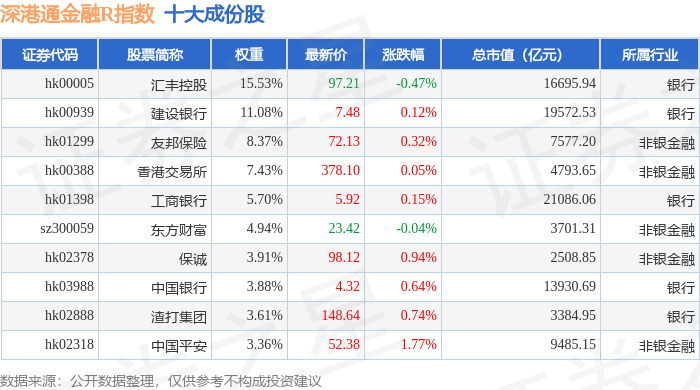证券之星消息,11月25日,深港通金融R(483025)指数报收于10650.29点,涨0.24%,成交299.27亿元,换手率0.31%。当日该指数成份股中,上涨的有65家,海德股份以4.16%的涨幅领涨,下跌的有20家,广发证券以3.43%的跌幅领跌。