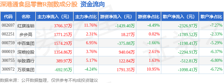 资金流向方面,深港通食品零售R(483037)指数成份股当日主力资金净流入合计8163.8万元,游资资金净流入合计1057.23万元,散户资金净流出合计9221.02万元。成份股资金流向详情见下表: