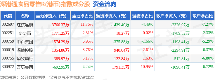 资金流向方面,深港通食品零售R(港币)(483038)指数成份股当日主力资金净流入合计8163.8万元,游资资金净流入合计1057.23万元,散户资金净流出合计9221.02万元。成份股资金流向详情见下表: