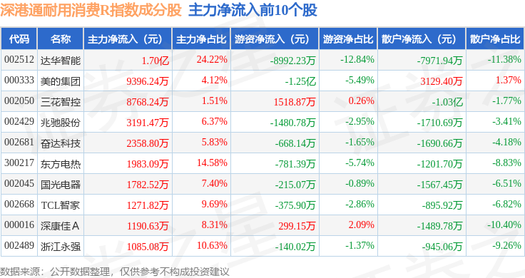 资金流向方面,深港通耐用消费R(483049)指数成份股当日主力资金净流入合计1.08亿元,游资资金净流出合计9605.41万元,散户资金净流出合计1177.15万元。成份股资金流向详情见下表: