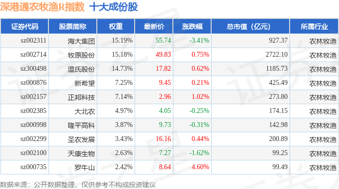 深港通农牧渔R(483051)指数十大成份股详情如下: