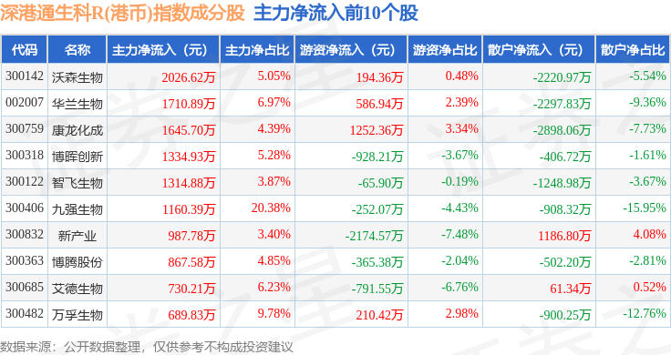 资金流向方面,深港通生科R(港币)(483060)指数成份股当日主力资金净流入合计7413.13万元,游资资金净流入合计1.3亿元,散户资金净流出合计2.04亿元。成份股资金流向详情见下表: