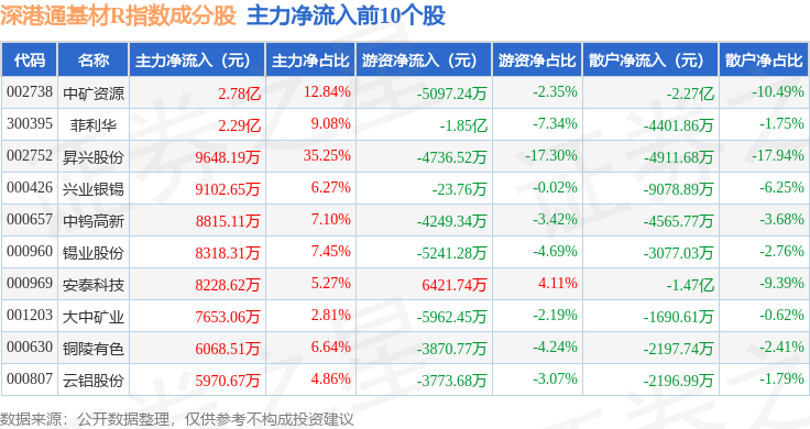 资金流向方面,深港通基材R(483061)指数成份股当日主力资金净流入合计6.42亿元,游资资金净流出合计4065.82万元,散户资金净流出合计6.01亿元。成份股资金流向详情见下表: