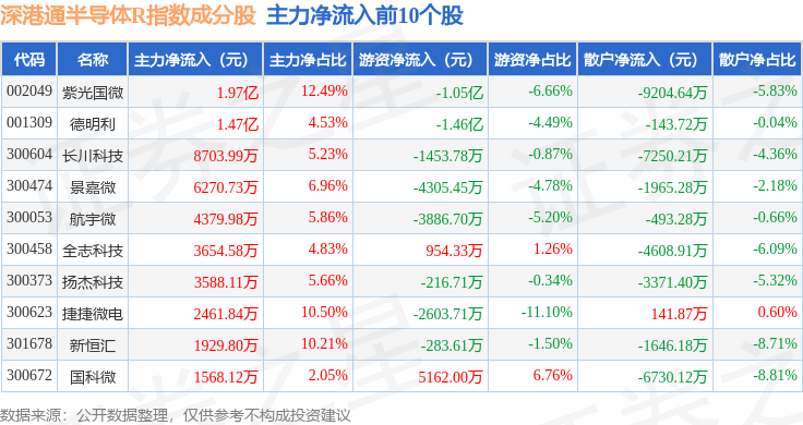 资金流向方面,深港通半导体R(483067)指数成份股当日主力资金净流入合计3.24亿元,游资资金净流出合计2.88亿元,散户资金净流出合计3565.08万元。成份股资金流向详情见下表: