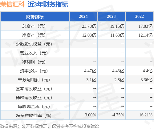 从目前公布的财报来看,荣信汇科2024年总资产为23.78亿元,净资产为12.03亿元;近3年净利润分别为nan元(2024年),nan元(2023年),nan元(2022年)。详情见下表: