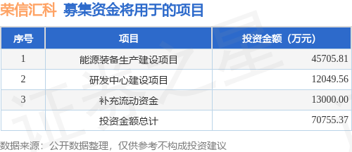 证券之星消息,荣信汇科电气股份有限公司(简称:荣信汇科)拟在上交所科创板上市,募资总金额为6.0亿元,保荐机构为国金证券股份有限公司。募集资金拟用于能源装备生产建设项目、研发中心建设项目、补充流动资金,详见下表: