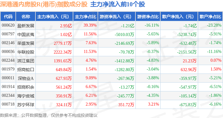 资金流向方面,深港通内房股R(港币)(483084)指数成份股当日主力资金净流入合计2.76亿元,游资资金净流出合计9623.95万元,散户资金净流出合计1.8亿元。成份股资金流向详情见下表: