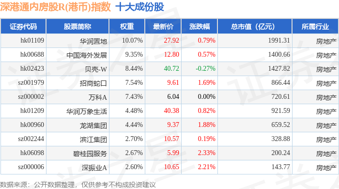 深港通内房股R(港币)(483084)指数十大成份股详情如下: