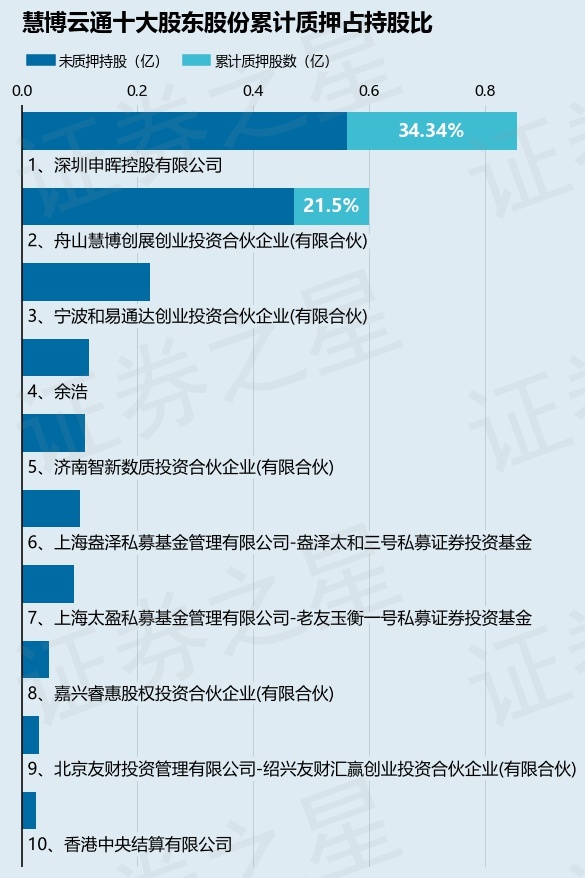 截止本公告日,股东深圳申晖控股有限公司已累计质押股份2936.0万股,占其持股总数的34.34%,股东舟山慧博创展创业投资合伙企业(有限合伙)已累计质押股份1290.0万股,占其持股总数的21.5%。本次质押后慧博云通十大股东的累计质押股份占持股比例(占持股比例的计算以公司最新一期财务报表公布的十大股东的持股总数为基准)见下图: