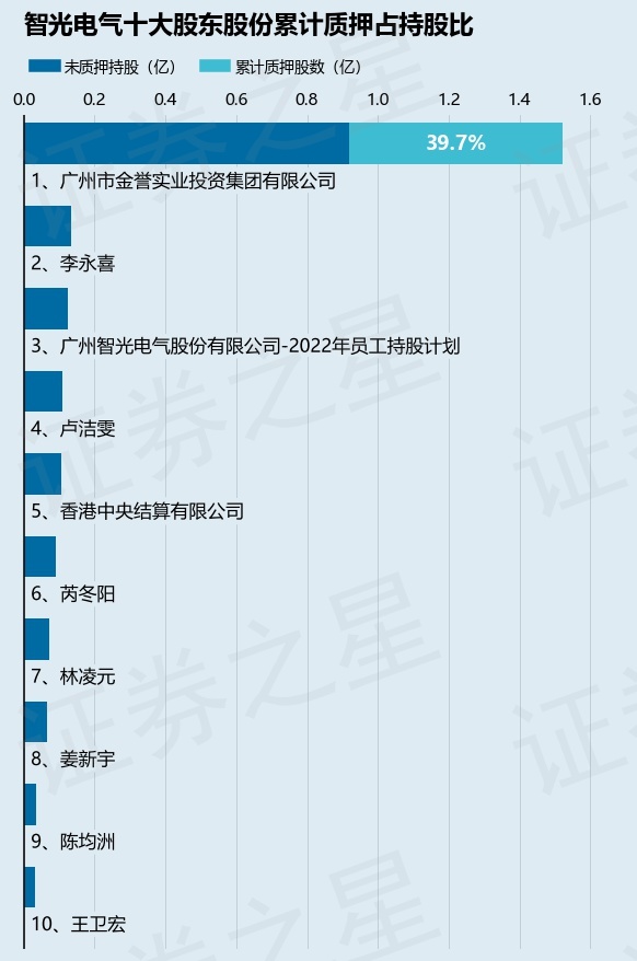 截止本公告日,股东广州市金誉实业投资集团有限公司已累计质押股份6041.0万股,占其持股总数的39.7%。本次质押后智光电气十大股东的累计质押股份占持股比例(占持股比例的计算以公司最新一期财务报表公布的十大股东的持股总数为基准)见下图: