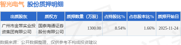 证券之星消息,智光电气(002169)11月25日公开信息显示,股东广州市金誉实业投资集团有限公司向国泰海通证券股份有限公司合计质押1300.0万股,占总股本1.66%。质押详情见下表: