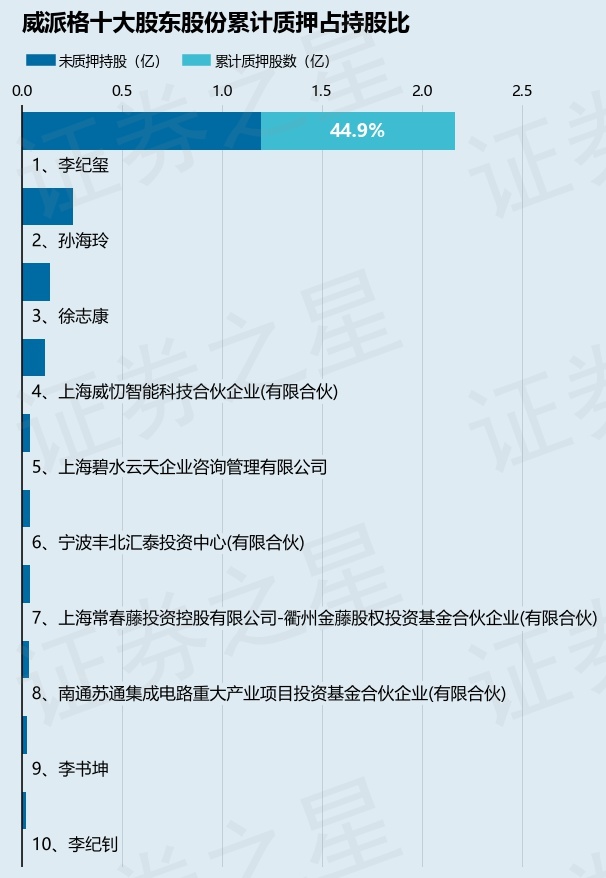 截止本公告日,股东李纪玺已累计质押股份9732.0万股,占其持股总数的44.9%。本次质押后威派格十大股东的累计质押股份占持股比例(占持股比例的计算以公司最新一期财务报表公布的十大股东的持股总数为基准)见下图: