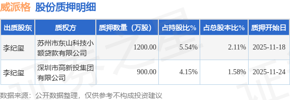 证券之星消息,威派格(603956)11月25日公开信息显示,股东李纪玺向苏州市东山科技小额贷款有限公司、深圳市高新投集团有限公司合计质押2100.0万股,占总股本3.69%。质押详情见下表:
