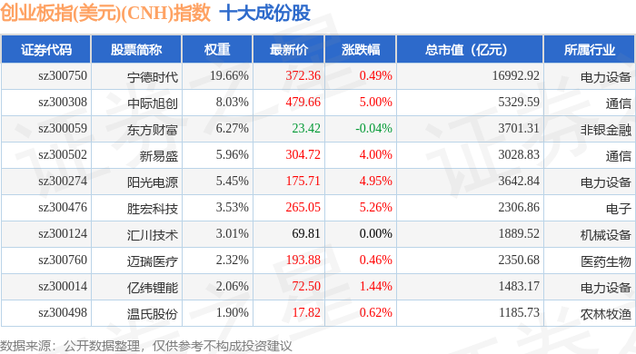创业板指(美元)(CNH)(970007)指数十大成份股详情如下: