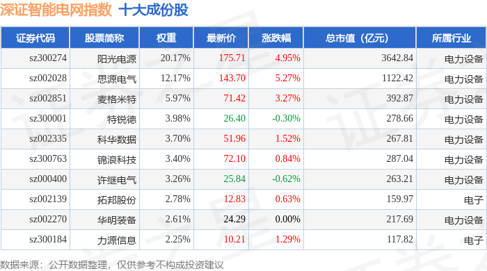 证券之星消息,11月25日,深证智能电网(970054)指数报收于3798.84点,涨2.67%,成交317.04亿元,换手率3.02%。当日该指数成份股中,上涨的有42家,科信技术以11.99%的涨幅领涨,下跌的有6家,国能日新以1.14%的跌幅领跌。