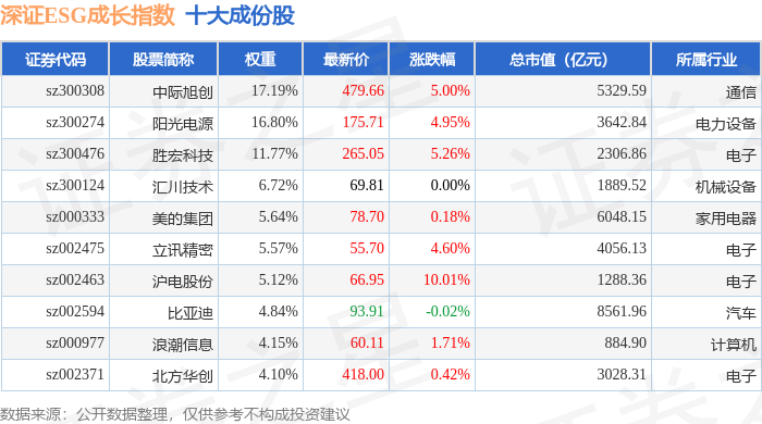 深证ESG成长(970060)指数十大成份股详情如下: