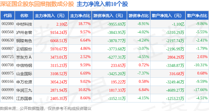 资金流向方面,深证国企股东回报(970064)指数成份股当日主力资金净流入合计4.25亿元,游资资金净流出合计1.07亿元,散户资金净流出合计3.19亿元。成份股资金流向详情见下表: