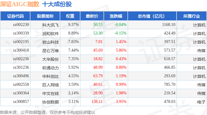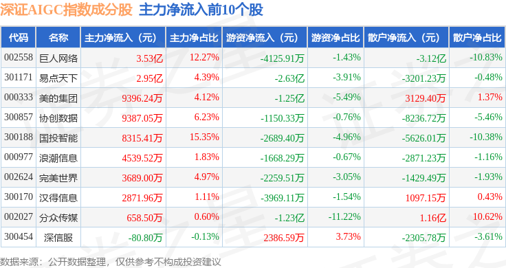 资金流向方面,深证AIGC(970075)指数成份股当日主力资金净流出合计1.86亿元,游资资金净流出合计5.11亿元,散户资金净流入合计6.96亿元。成份股资金流向详情见下表: