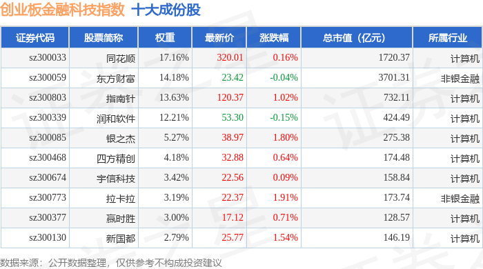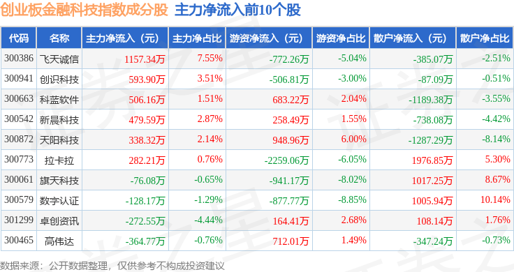 资金流向方面,创业板金融科技(970085)指数成份股当日主力资金净流出合计8.42亿元,游资资金净流出合计3245.95万元,散户资金净流入合计8.75亿元。成份股资金流向详情见下表: