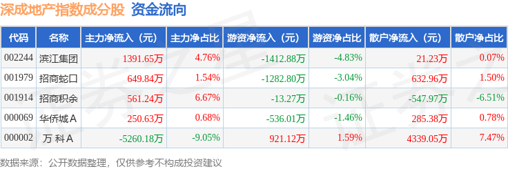 资金流向方面,深成地产(971001)指数成份股当日主力资金净流出合计2406.82万元,游资资金净流出合计2323.84万元,散户资金净流入合计4730.66万元。成份股资金流向详情见下表: