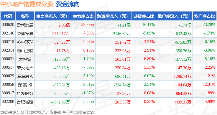 资金流向方面,中小地产(971002)指数成份股当日主力资金净流入合计2.5亿元,游资资金净流出合计1.33亿元,散户资金净流出合计1.16亿元。成份股资金流向详情见下表:
