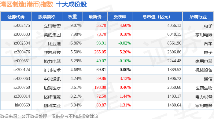 湾区制造(港币)(980010)指数十大成份股详情如下: