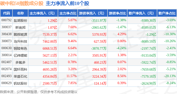 资金流向方面,碳中和50(980021)指数成份股当日主力资金净流入合计2.84亿元,游资资金净流入合计6.29亿元,散户资金净流出合计9.14亿元。成份股资金流向详情见下表: