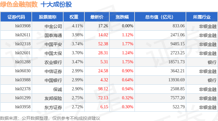 绿色金融(980052)指数十大成份股详情如下: