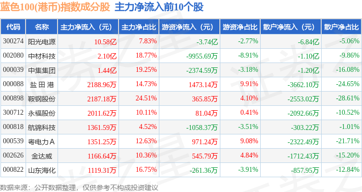 资金流向方面,蓝色100(港币)(980069)指数成份股当日主力资金净流入合计6.04亿元,游资资金净流出合计1.05亿元,散户资金净流出合计4.99亿元。成份股资金流向详情见下表: