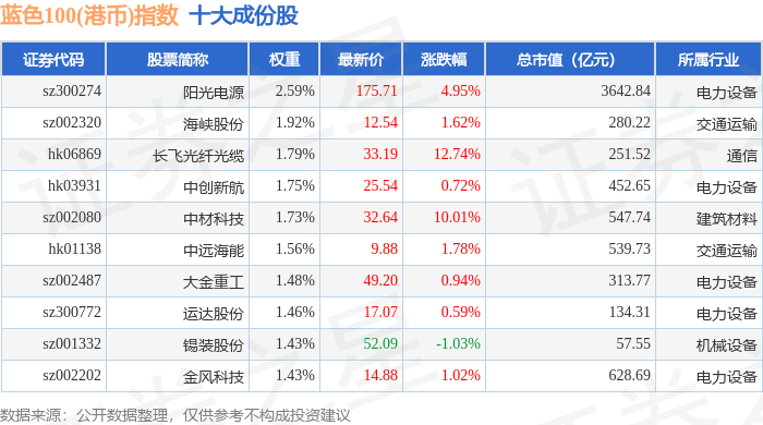 蓝色100(港币)(980069)指数十大成份股详情如下: