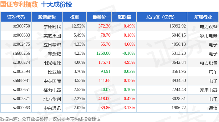 国证专利(980070)指数十大成份股详情如下: