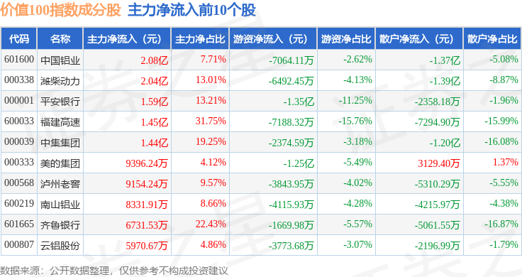 资金流向方面,价值100(980081)指数成份股当日主力资金净流入合计17.64亿元,游资资金净流出合计4.44亿元,散户资金净流出合计13.24亿元。成份股资金流向详情见下表: