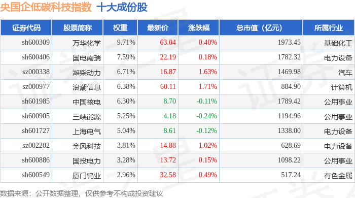 央国企低碳科技(980082)指数十大成份股详情如下: