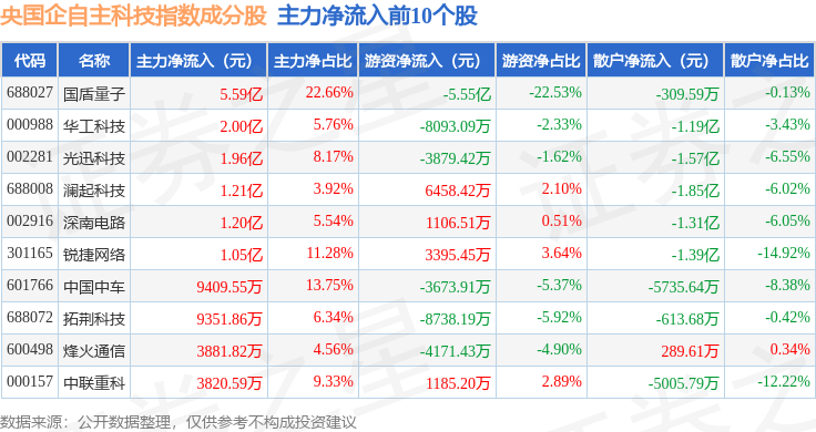 资金流向方面,央国企自主科技(980083)指数成份股当日主力资金净流出合计1.79亿元,游资资金净流入合计1.78亿元,散户资金净流入合计90.7万元。成份股资金流向详情见下表: