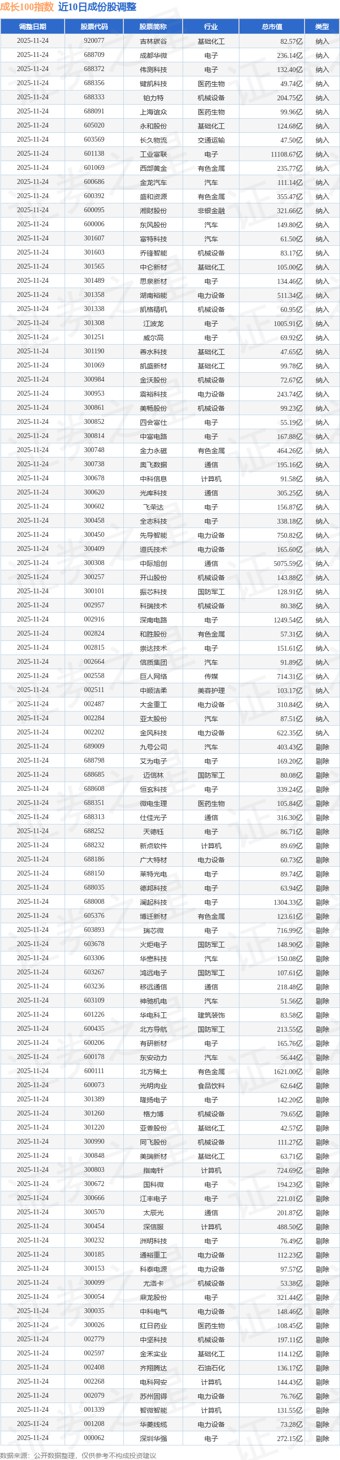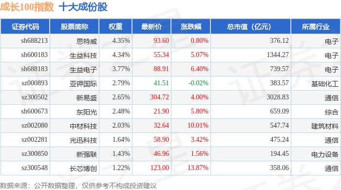 成长100(980080)指数十大成份股详情如下: