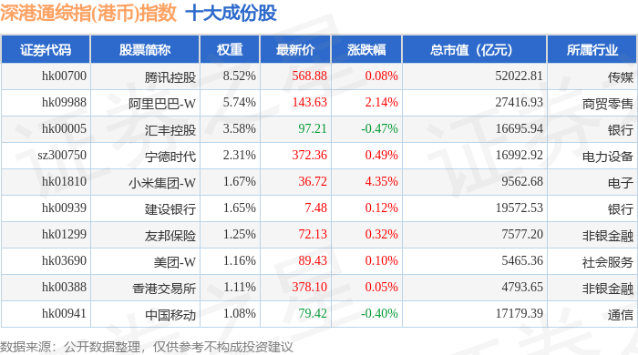 深港通综指(港币)(983006)指数十大成份股详情如下: