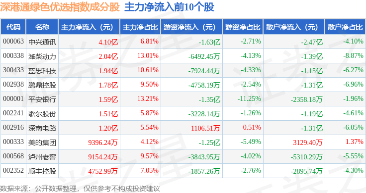 资金流向方面,深港通绿色优选(983011)指数成份股当日主力资金净流入合计11.64亿元,游资资金净流出合计4.27亿元,散户资金净流出合计7.38亿元。成份股资金流向详情见下表:
