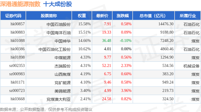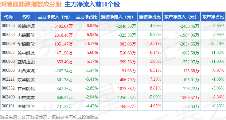 资金流向方面,深港通能源(983013)指数成份股当日主力资金净流入合计3783.22万元,游资资金净流入合计1233.39万元,散户资金净流出合计5016.61万元。成份股资金流向详情见下表: