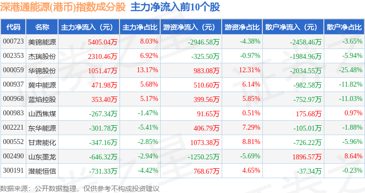 资金流向方面,深港通能源(港币)(983014)指数成份股当日主力资金净流入合计3783.22万元,游资资金净流入合计1233.39万元,散户资金净流出合计5016.61万元。成份股资金流向详情见下表:
