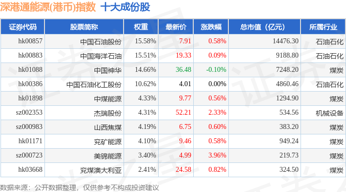 深港通能源(港币)(983014)指数十大成份股详情如下: