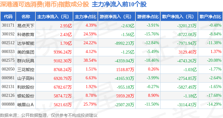 资金流向方面,深港通可选消费(港币)(983020)指数成份股当日主力资金净流出合计31.37亿元,游资资金净流入合计5.56亿元,散户资金净流入合计25.8亿元。成份股资金流向详情见下表: