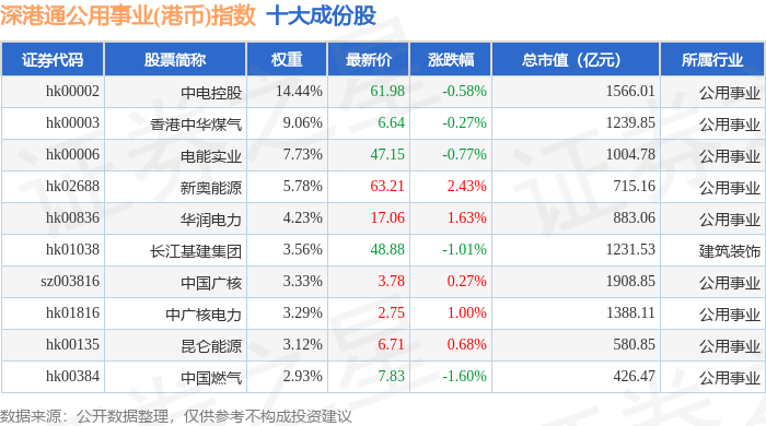 深港通公用事业(港币)(983032)指数十大成份股详情如下: