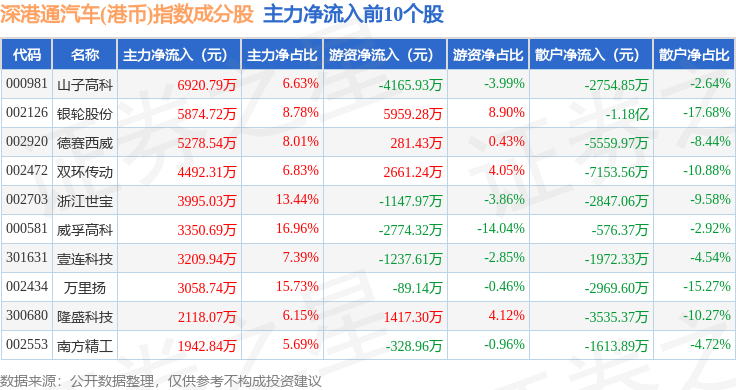 资金流向方面,深港通汽车(港币)(983040)指数成份股当日主力资金净流出合计4.64亿元,游资资金净流入合计1.67亿元,散户资金净流入合计2.98亿元。成份股资金流向详情见下表: