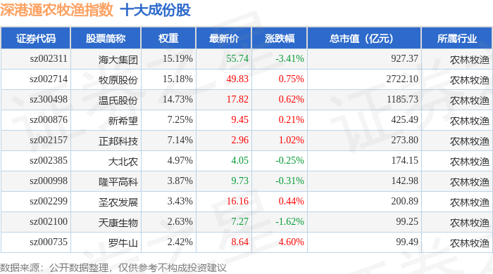 深港通农牧渔(983051)指数十大成份股详情如下: