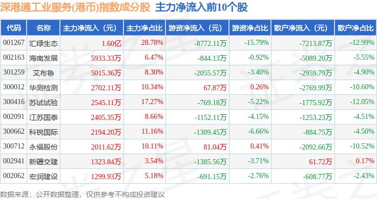 资金流向方面,深港通工业服务(港币)(983056)指数成份股当日主力资金净流出合计8607.21万元,游资资金净流出合计4075.38万元,散户资金净流入合计1.27亿元。成份股资金流向详情见下表: